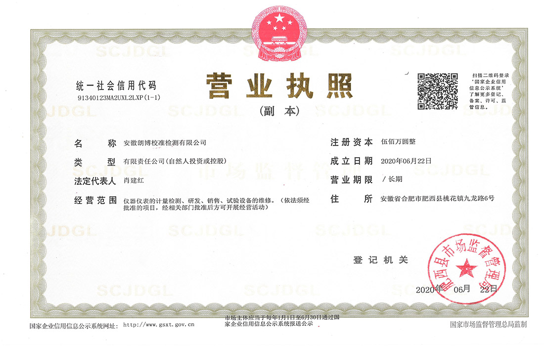 2020年6月22日,安徽朗博校準(zhǔn)檢測有限公司成立